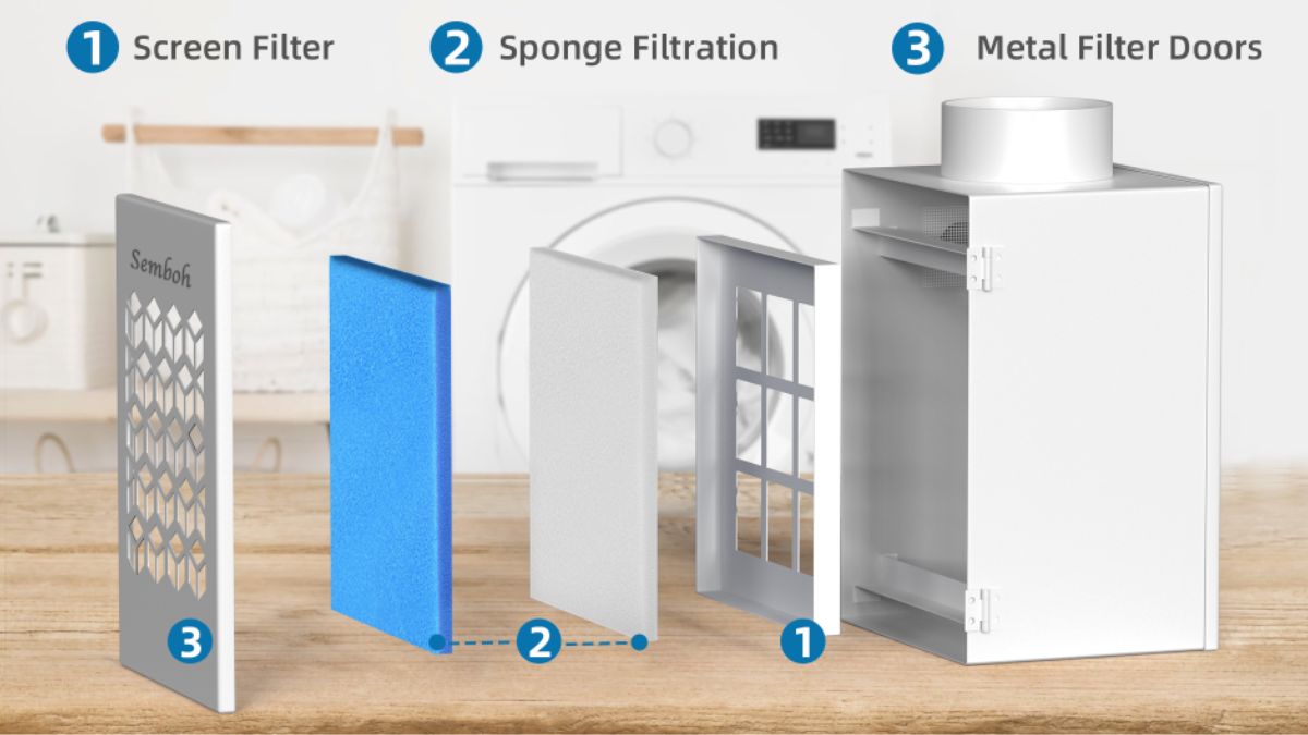 This system ensures the exhaust air from your dryer is filtered before it enters your home, helping maintain indoor air quality and reduce allergens.