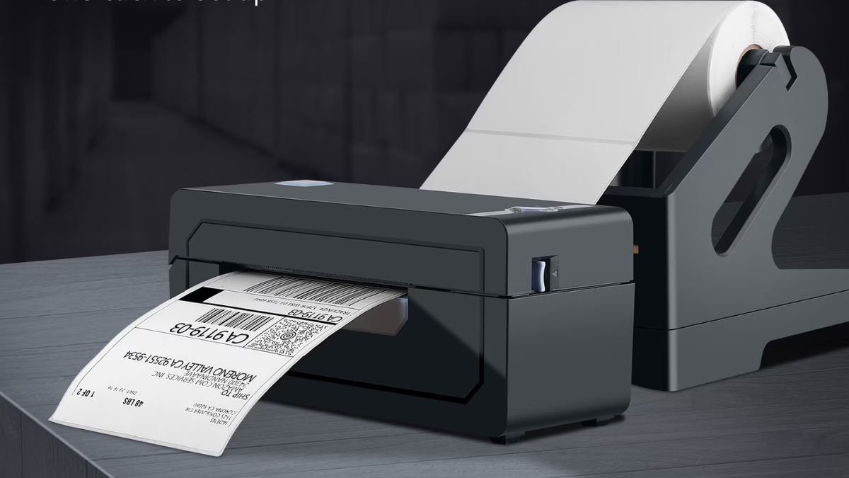 A thermal label printer, primarily designed for printing shipping labels, barcodes, and stickers. Instead of using ink cartridges or toner, it relies on heat-sensitive paper. When the print head heats specific areas of the paper, it creates text and images instantly.